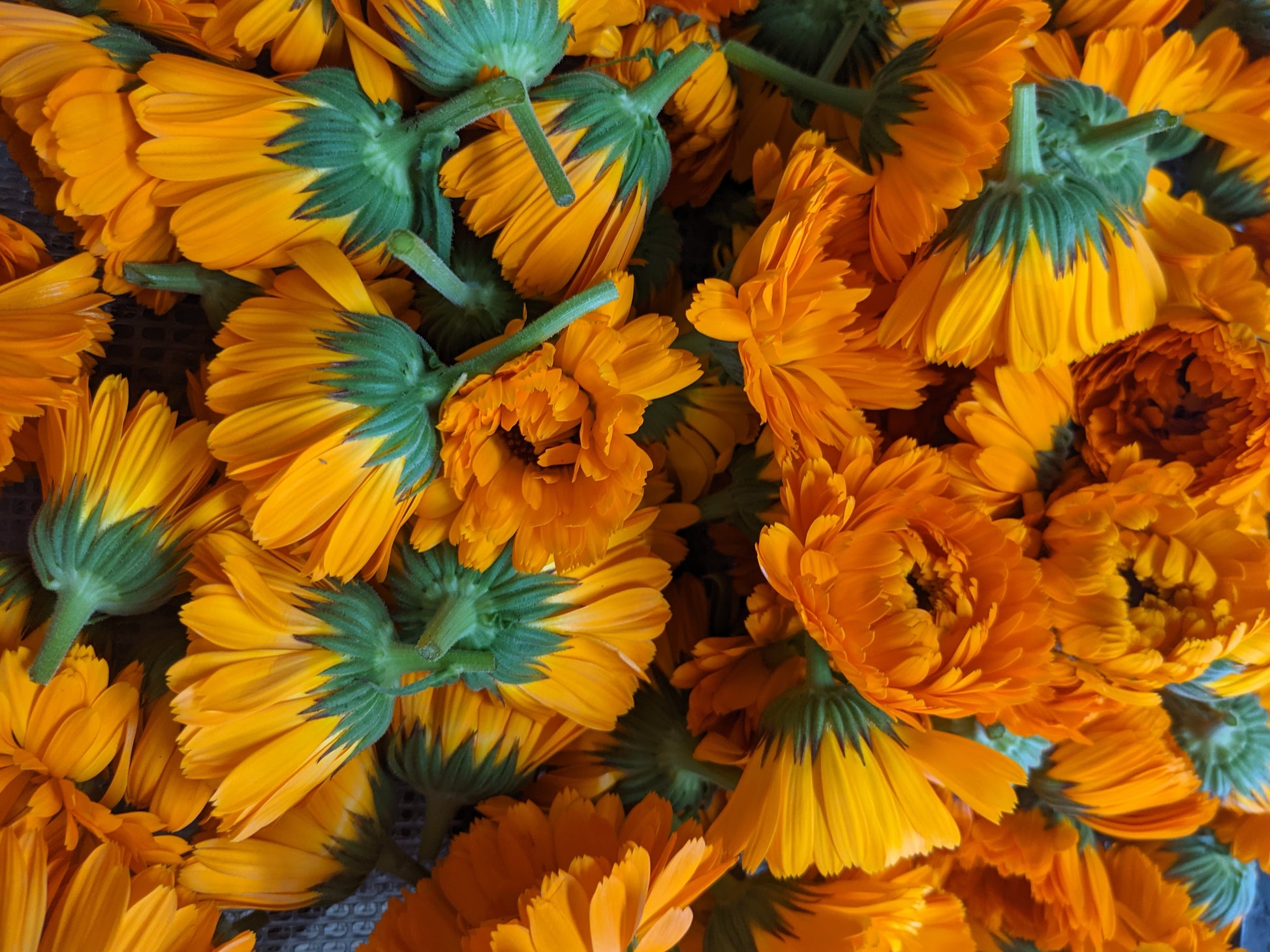 Hand harvested Calendula (Calendula officinalis). The Erfurter (aka Orange Zinger) variety is preferred for its high resin content.