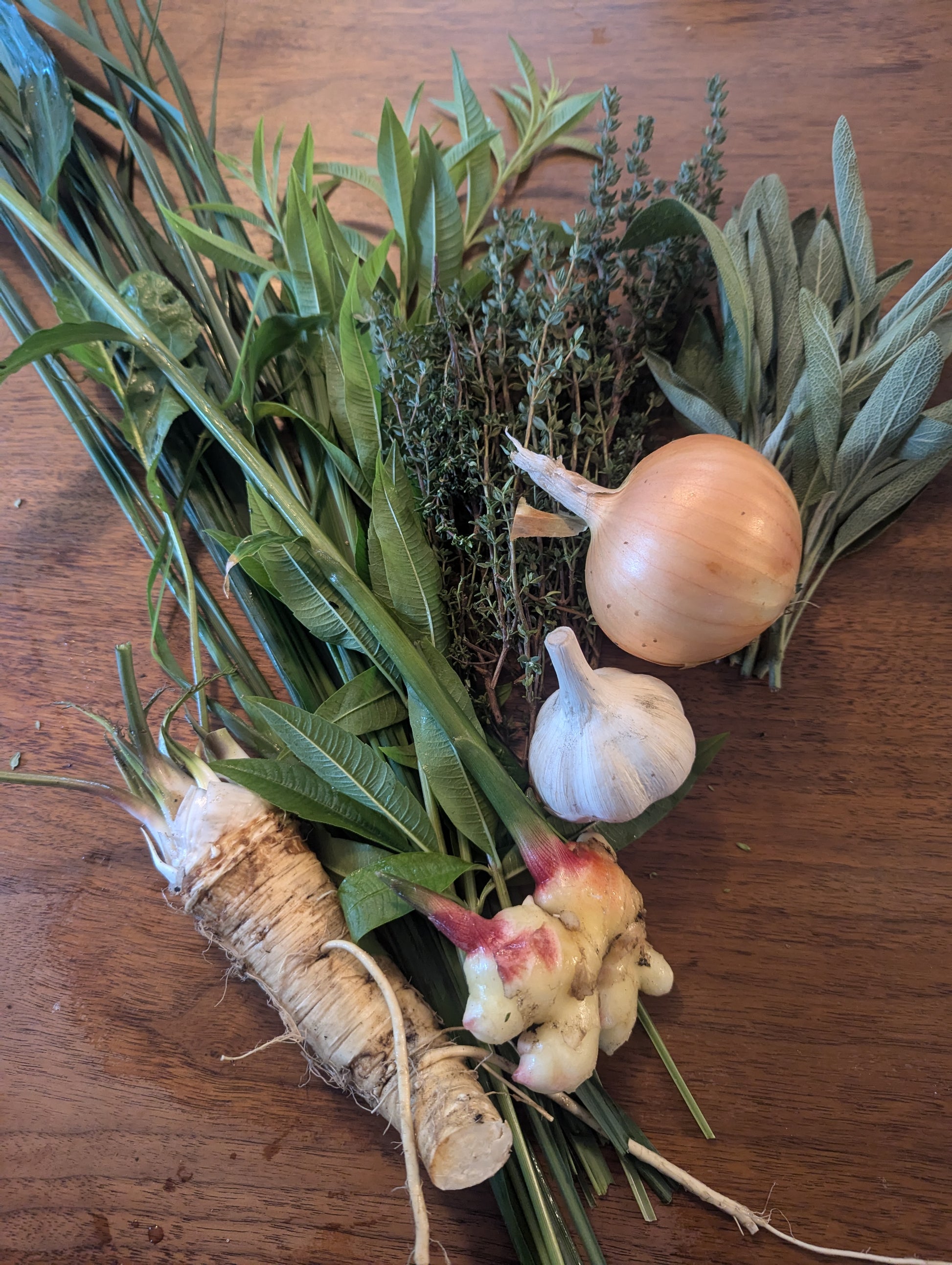 Onion, Garlic, Horseradish, Baby Ginger, Kitchen Herbs, Hot Peppers, Lemongrass and/or Lemon Verbena. Optional: add Elecampane for respiratory health (not recommended for pregnancy or nursing)